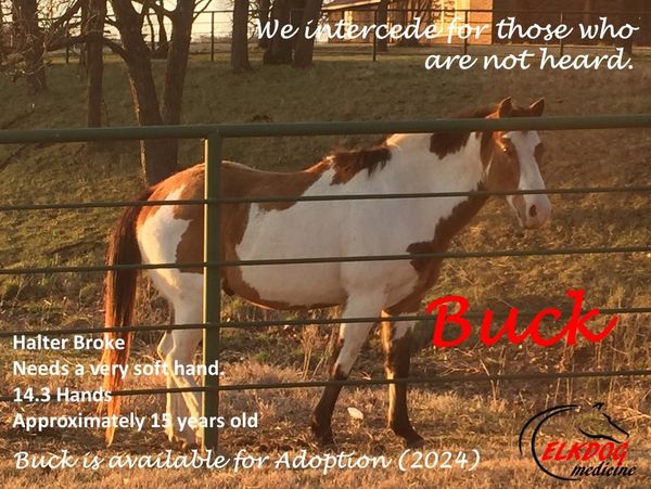 Buck is a gelded "bay dun frame-overo pinto with splash." He's unique. He came to us on September 18, 2016 with Missy, from Trinity Circle Horses Healing Hearts in Neosho, Missouri, in order for that rescue to make room for another animal in need. He was estimated to be 8 years old. He was moved to the Galena facility in March 2017 and then moved again with the others to Elkdog medicine Ranch in 2017 when it was first purchased. He believes himself to still be a stallion and acts accordingly around mares in season. He is still able to cover a mare successfully so we keep him separated from the main herd because of this. All the ladies love him. This behavior does not extend to his interactions with people. He seeks attention, is easy to catch and halter, and will follow you around the pasture out of curiosity. He accepts a saddle but doesn't appear to have a forward gear. Needs a refresher and lots of work before riding.